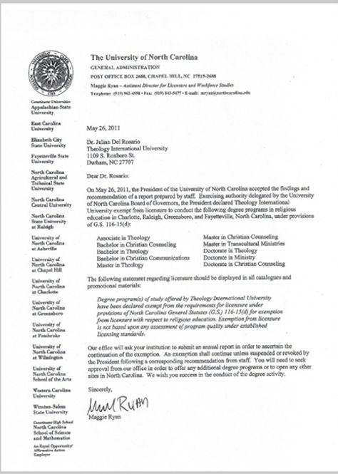 In an ongoing effort to operate with the support of all authorities, Theological International University managed with the institution governing education in the state of North Carolina, which is the University of North Carolina.Our degrees and curricula have been reviewed by this competent authority, giving the go-ahead for theological education.